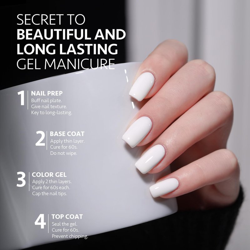 - 4 Weeks Long-Lasting: Buff your nail bed before base coat to give your nail texture. Apply top coat after color gel for shiny finish.