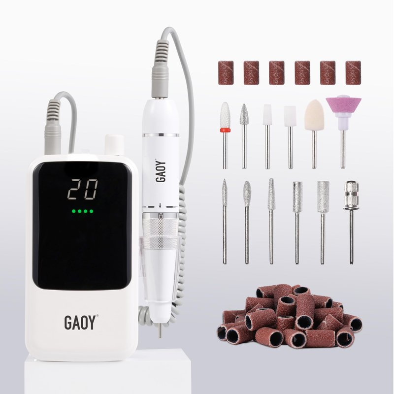 GAOY Rechargeable Cordless Nail Drill for Beginners, Electric Nail File with 12 Nail Drill Bits and Sanding Band Set for Acrylic and Gel Nails, White