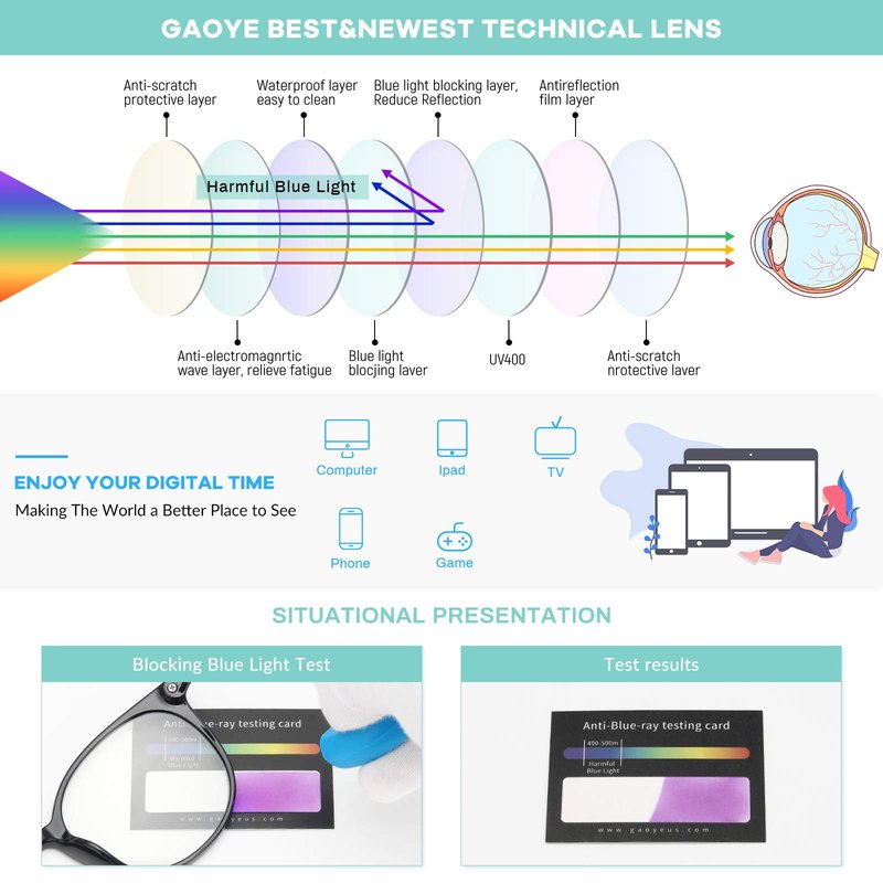 - [Bluelight Glasses] Blue light blockers with UV400 lenses block 100% harmful blu-ray & UVA/UVB rays, reduce discomfort from vedio, tv, phone, laptop, computer gaming or working under fluorescent lights; Protects your vision, help you anti glare, headache, eye strain, dry eye and sleep better