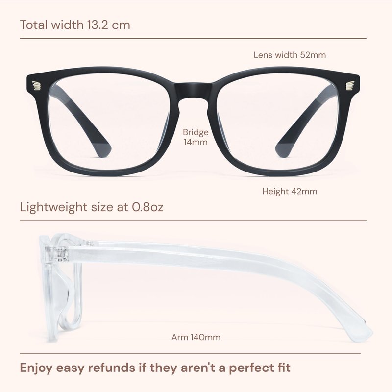 - [Product Dimension] Lens Width: 52mm(2.05in), Lens Height: 42mm(1.65in), Temple Length: 140mm(5.51in), Nose Bridge: 14mm(0.55in), Frame Width: 140mm(5.51in)