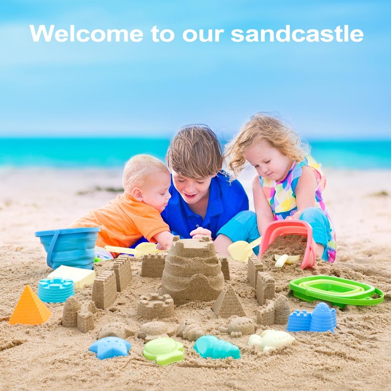 - Super value kids sand toys for beach travel and sand box, including foldable beach bucket *3, sand shovel *3, sand castle mold *4, sea animal mold *4.