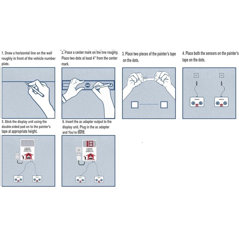 It is recommended that you place a marking tape on the front wall before apply sticky pads. Install the display and sensor units using using the sticky pads. Install the sensors at the same height as the bumper of your car so they can detect your car position. Plugin the adapter to the AC outlet.