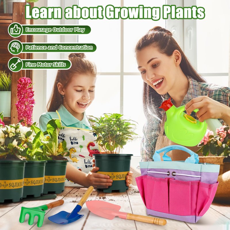 - Kids Gardening Tool Set: This kids gardening tool set contains Tote Bag,Watering Can, Apron, Shovel, Rake, Flowerpot and Arm Sleeves Covers. The kids garden kit is perfect for your kids to play outdoors such as gardens, farms and yards.