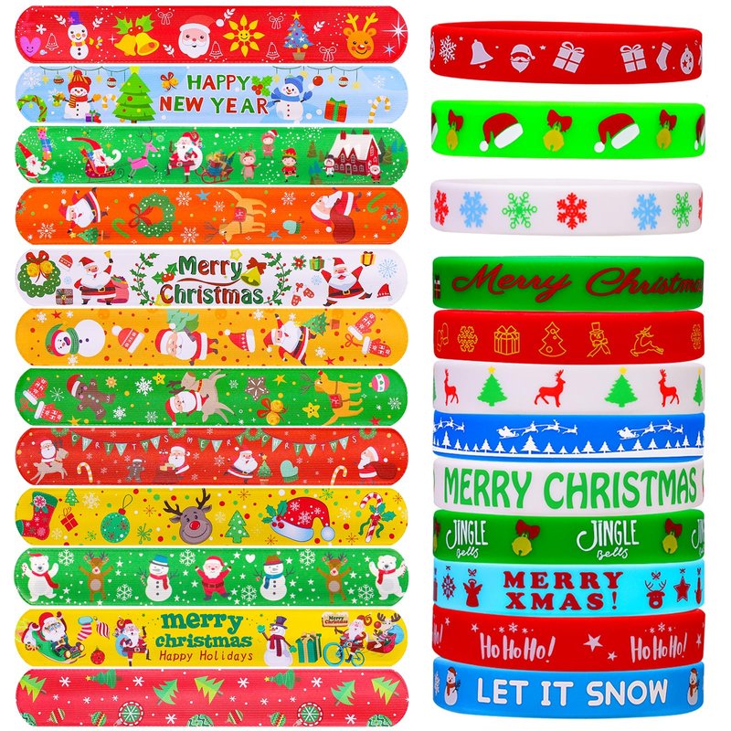 - [Package Includes]: 12 christmas style rubber wristbands and 12 christmas style Slap bracelets. Brightly colored, it's perfect for Christmas party favors, prizes for kids' classes, and stuffing.