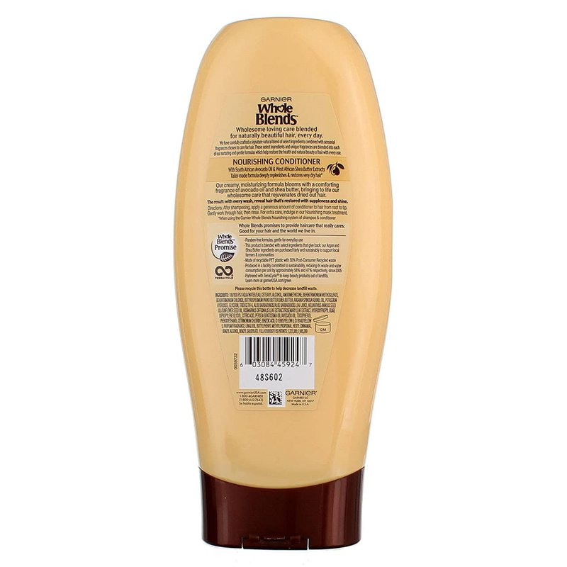 Our creamy, moisturizing conditioner for very dry hair blooms with a comforting fragrance of avocado oil and shea butter, bringing to life our wholesome care that rejuvenates dried out hair. When using Garnier Whole Blends Nourishing system of shampoo & conditioner. À Deeply replenishes and restores, For Very Dry Hair À Conditioner formula with South African avocado oil and West African shea butter extracts À Enriched with a Natural Blend, Paraben-Free À Gentle for everyday use After shampooing, apply a generous amount of conditioner to hair from root to tip. Gently work through hair, then rinse. For extra care, indulge in our Nourishing mask treatment.