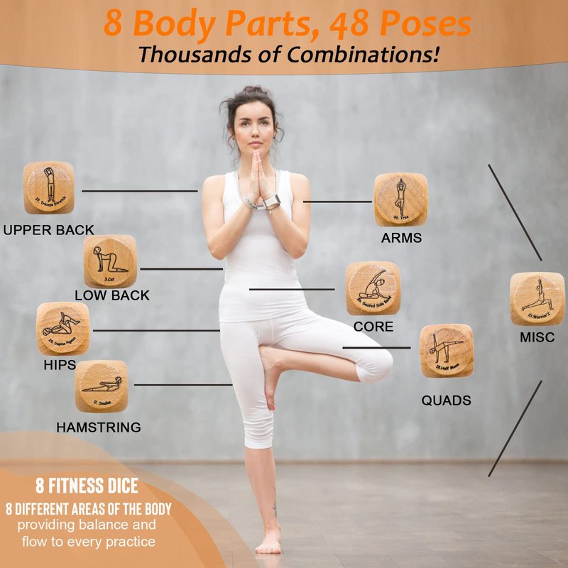 - 8 Body Parts, 48 Poses, Tons of Combinations -Rolling all 8 dice to make a random yoga routine is a good way to keep things interesting. 8 fitness dice focus on 8 different areas of the body, providing balance and flow to every practice. With seated, standing, balancing, twists, and more, you're sure to find a new pose or stretch to inspire your pose. The variety of the poses and the unpredictability of these yoga props will make your practice much more fun.