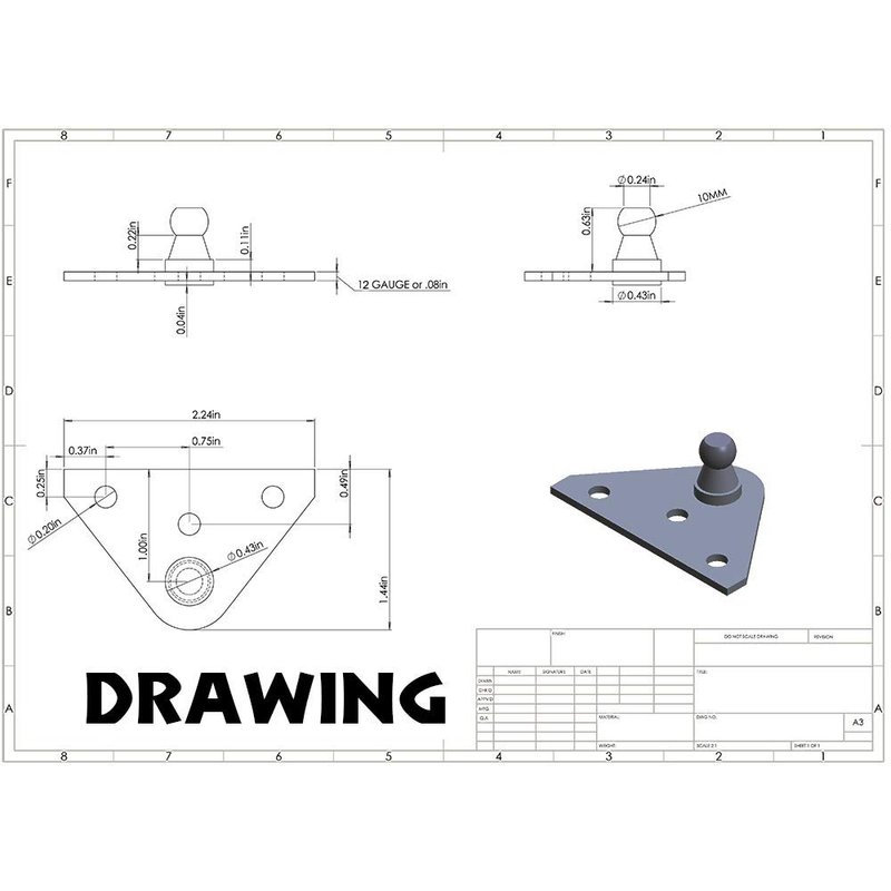 This is a 3-hole Gas Spring Mounting Bracket for a 10mm Ball Stud fitting. It has a 0.63" inch height from the surface of the bracket to the top of the ball stud. This hardware bracket is made of a 12 gauge heavy duty steel construction and Zinc plated.