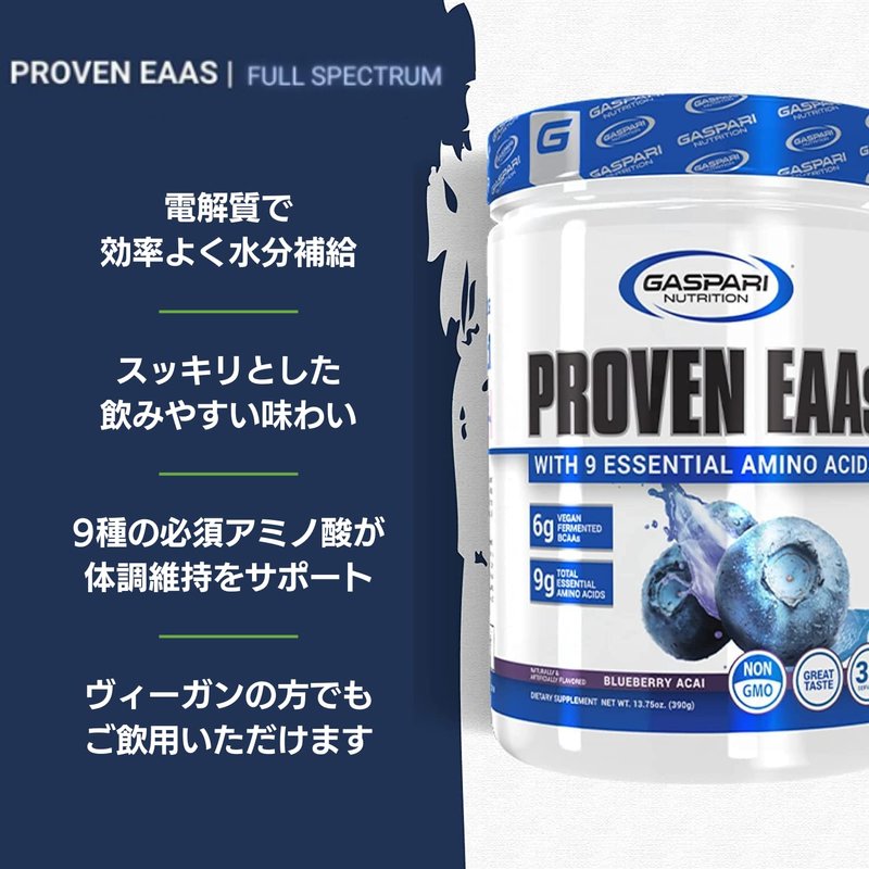 6 g Vegan Fermented BCAAs 9 g Total Essential Amino Acids Naturally & Artificially Flavored Dietary Supplement Non GMO Great Taste Full Spectrum of 9 Essential Amino Acids Leucine Heavy Ratio of Branched Chain Amino Acids 4:1:1 Electrolyte Matrix Himalayan Pink Salt Delivering Sodium, Potassium, Magnesium, & Calcium GMP - Good Manufacturing Practice Certified There are nine essential amino acids that must be present in sufficient amounts for the body to grow and repair muscle tissue. It is proven that these proteins are termed "essential" because the body does not produce them and, must get them from dietary sources. Without them, your body's ability to support anabolic activity may be compromised. Gaspari's Proven EAAs provide 9 grams of the full spectrum of all essential amino acids, including 6 grams of vegan fermented BCAAs in a scientifically supported Leucine heavy ratio of 4:1:1, to maximize muscle growth and recovery. Each serving is loaded with Vegan friendly EAAs in an electrolyte matrix powered by pink Himalayan salt, making Gaspari's Proven EAAs ideal for muscle blasting pre, intra or post workout supplementation.