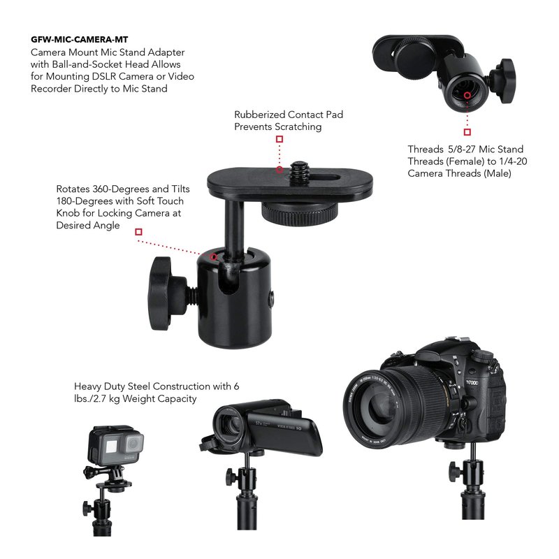 - Allows for Mounting DSLR Camera or Video Recorder Directly to Mic Stand Threads