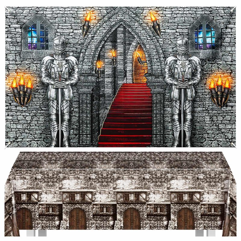 2 Pcs Medieval Party Decorations, Medieval Scene Setter Set, Castle Backdrop with Halloween Brick Stone Wall Tablecloth, Knight Themed Castle Decorations for Party Table Wall Decor