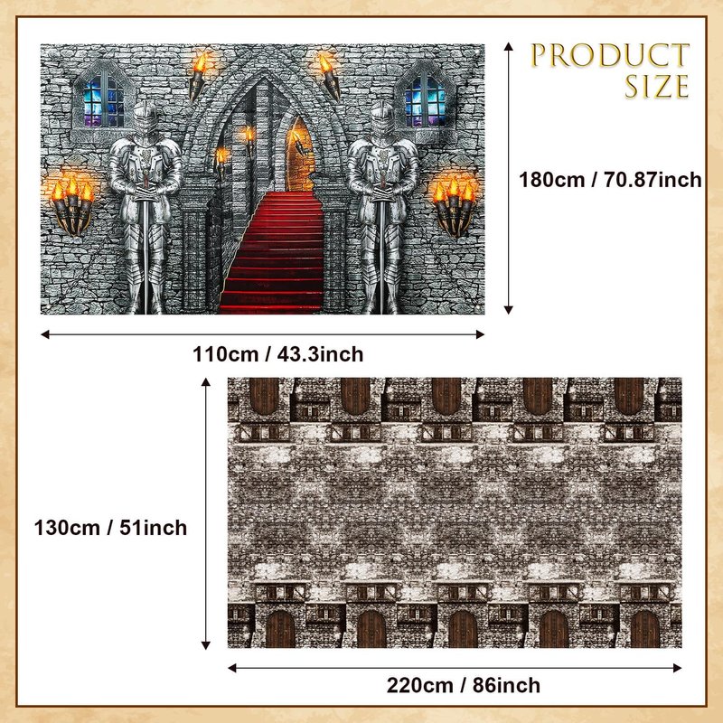 - SIZE INFORMATION: The size of the brick tablecloth is 130*220cm/51*86inch, and the medieval castle backdrop 180*110cm/70.87*43.3inch, the right size will make these backdrops look more real and party atmosphere more intense.