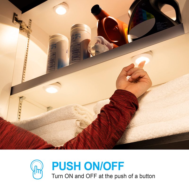 - Compact, portable and lightweight, this touch activated puck light can be used under counter, drawer, closet, pantry shelf, attic, bathroom, nightstand, hallway, garage, car trunk, emergency lighting, hurricanes, storms, tornados and more