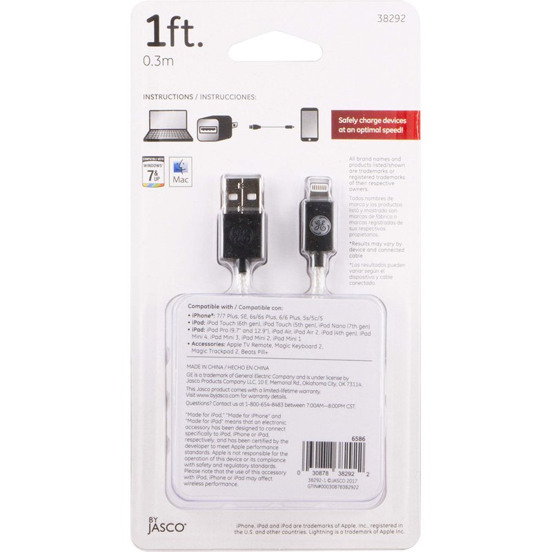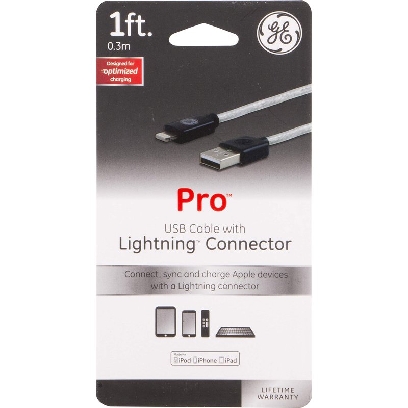 GE Pro 1ft. Lightning Connector USB Charging Cable, for iPhone 12/11/Pro/Max/XS/XR/X/8, iPad, iPad Mini, iPad Air, 38292