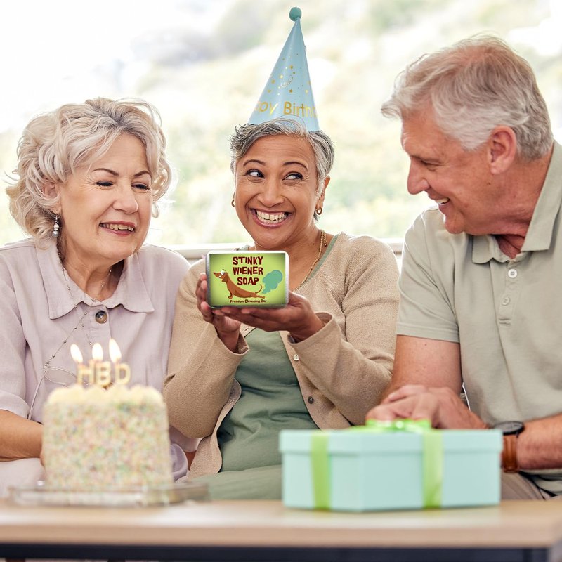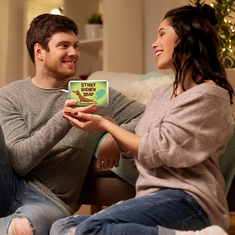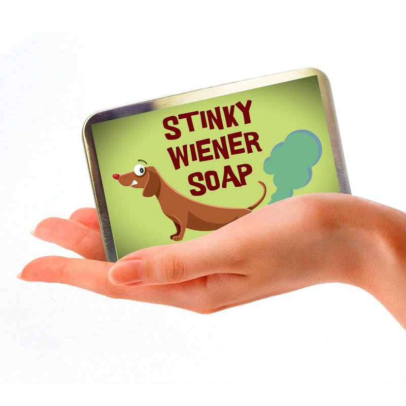 Elevate your gift-giving game with the Stinky Wiener Soap, a hilarious and unique gag gift designed to tickle the funny bones of adults with a penchant for humor. This quirky soap bar features a dachshund dog letting out a comical fart, adding a touch of whimsy to your daily hygiene routine. Infused with the invigorating scent of coffee, each use promises a delightful olfactory experience. Packaged in a charming decorative tin, this soap makes for a standout present that combines laughter and practicality. Perfect for dog lovers, coffee enthusiasts, or anyone in need of a good chuckle, the Stinky Wiener Soap is an unforgettable and light-hearted gift that adds a dash of humor to the bathroom. Surprise your friends or family with this whimsical creation, blending fun and functionality in a way that's bound to leave a lasting impression. It’s the perfect size for slipping into a Christmas stocking, birthday gift basket for guys, or weenie dog owner’s bath gift set.