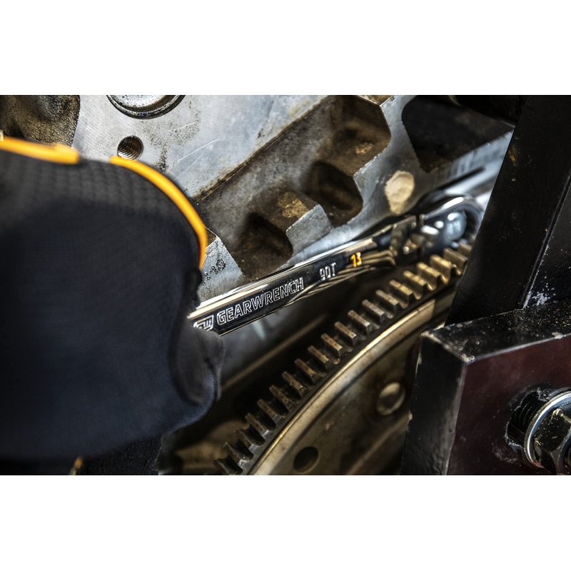 - 90-tooth ratcheting box end delivers a 4° swing arc to turn a fastener in tight spaces