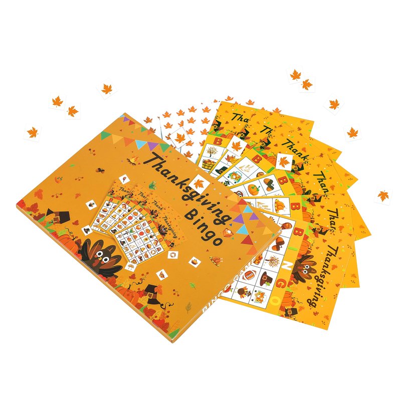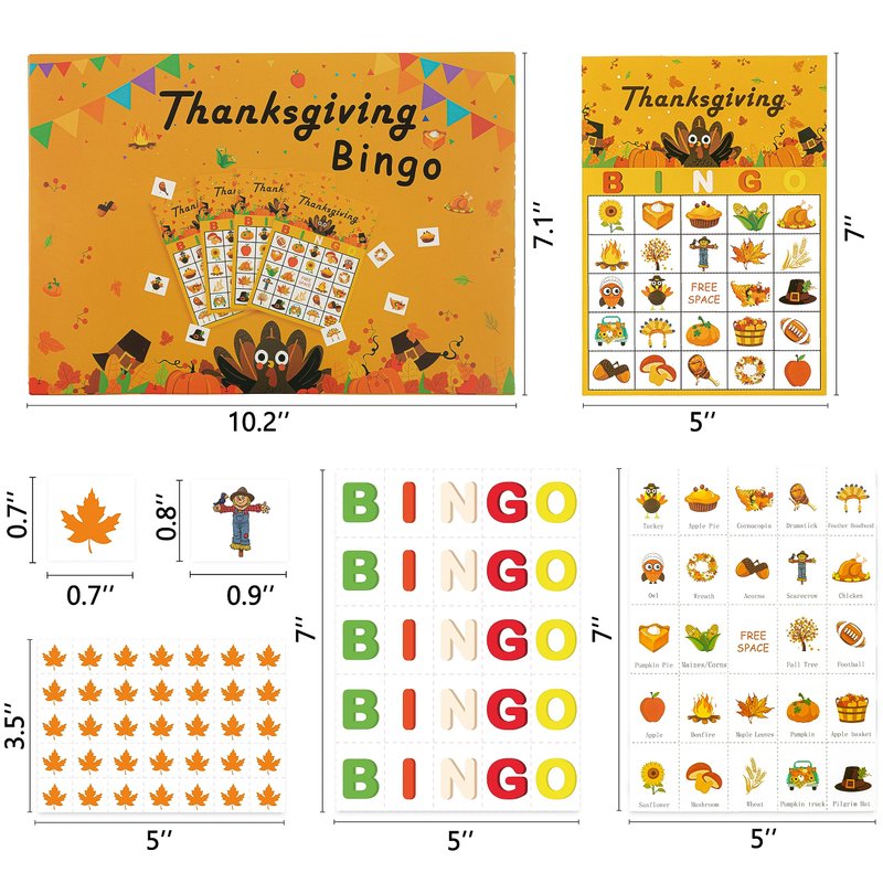 - Package includes- 32 thanksgiving bingo player cards , 18 maple leave player chips, 1 caller chips and 1 letter card with letter B, I, N, G, O.