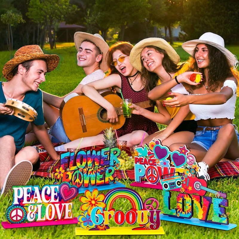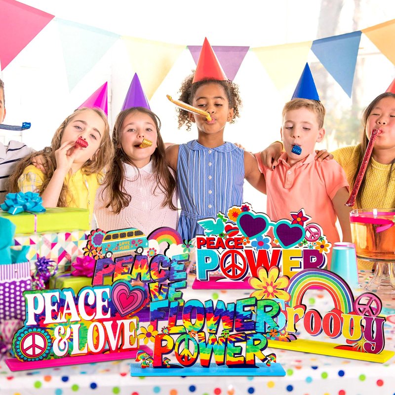 - Hippie Groovy Themed: if you're planning a hippie, groovy, or retro themed event or party, the groovy centerpieces for tables are the good choice for your decor needs; These table decorations are printed with beautiful tie dye and flower patterns, bright and colorful, combined many hippy elements, like bus, rainbow, heart shape, peace love signs, flowers, instantly transporting your guests back in time