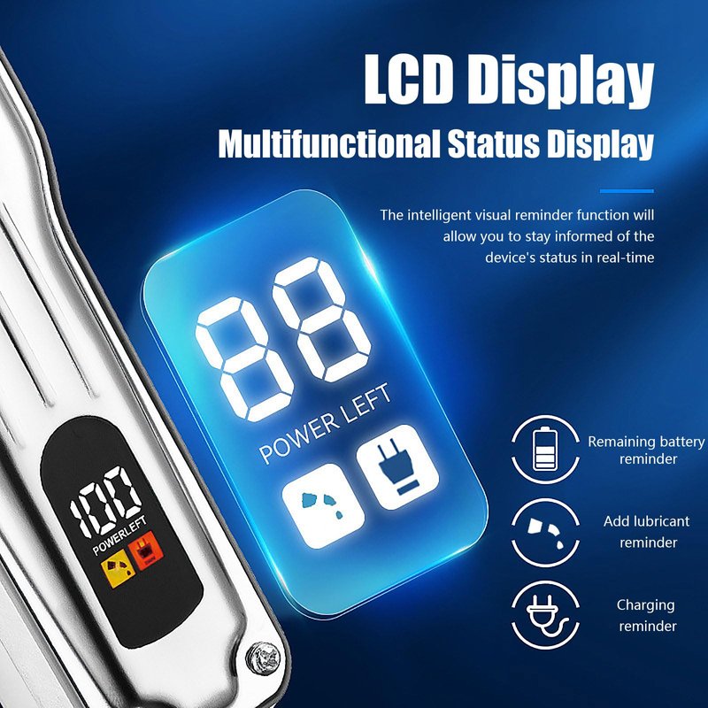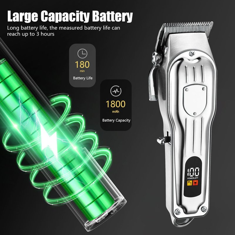 - Ergonomic Handle & LED Display: Our professional hair clippers are very comfortable to hold, allowing you to use them for a long time without getting tired. The built-in digital display allows you to quickly check the charging reminder, lubrication reminder, charging status, and speed display. Our hair clippers include high-capacity lithium-ion batteries (1800mAh & 600mAh) that can be used for 5 hours on full charge.
