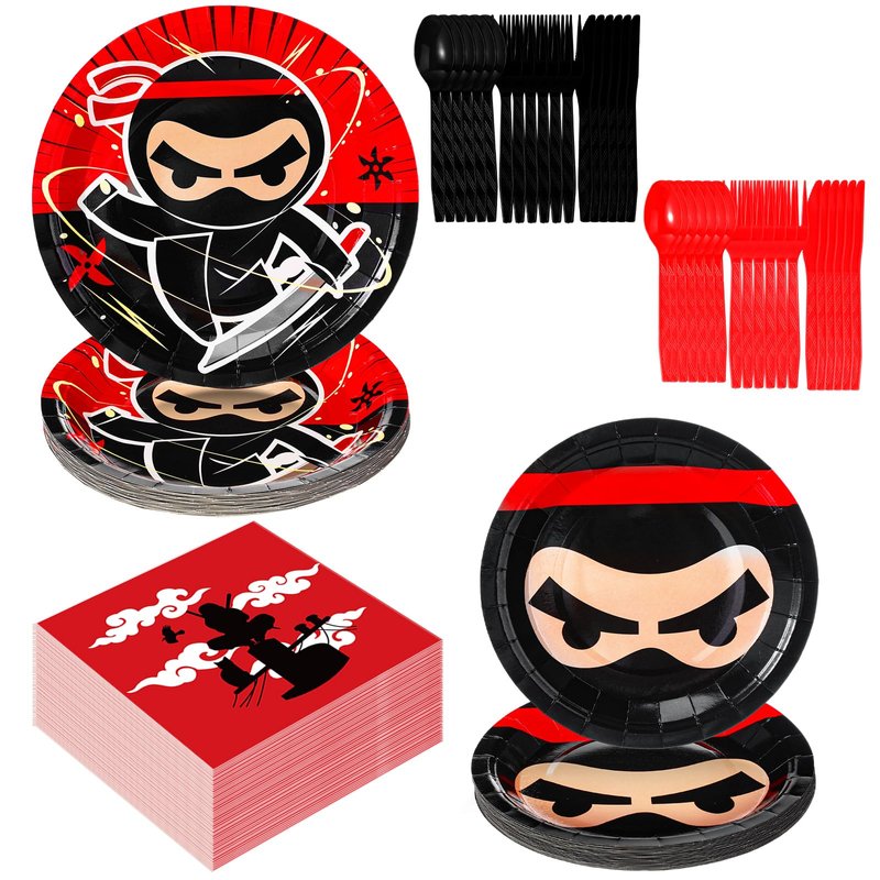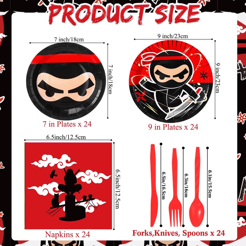 - Sufficient to Use: this set contains a total of 96 ninja theme birthday party supplies, including 24 paper 9 inch plates, 24 paper 7 inch plates, 24 paper napkins, measuring about 6.5 x 6.5 inches when folded, 24 plastic forks, 24 plastic knives, 24 plastic spoons, a rich combination to meet your party use and replacement