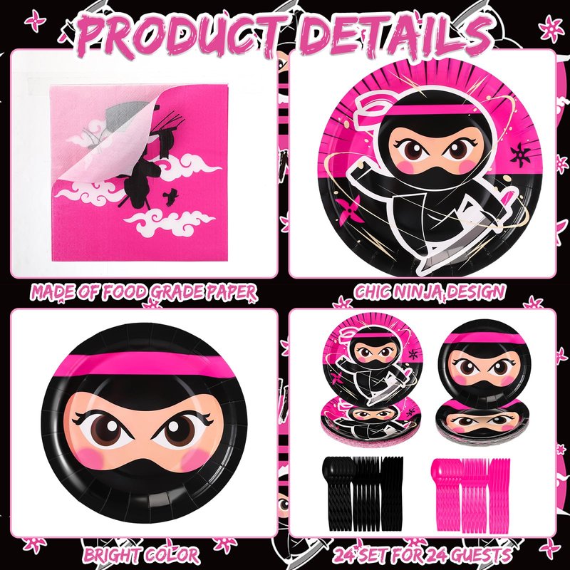 - Sufficient to Use: this set contains a total of 96 ninja theme birthday party supplies, including 24 paper 9 inch plates, 24 paper 7 inch plates, 24 paper napkins, measuring about 6.5 x 6.5 inches when folded, 24 plastic forks, 24 plastic knives, 24 plastic spoons, a rich combination to meet your party use and replacement