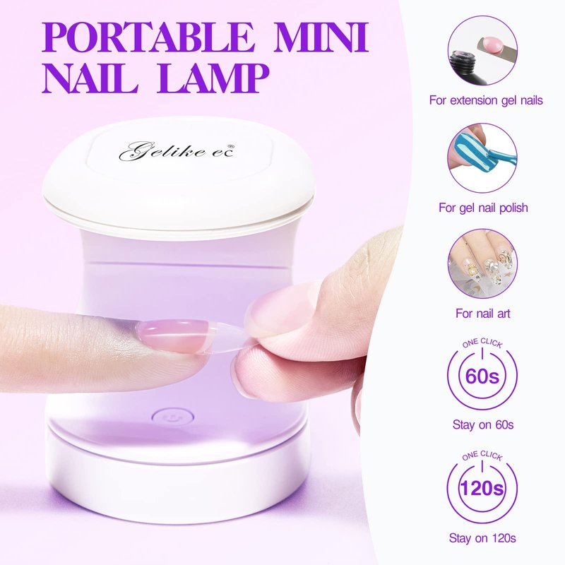 - [PORTABLE & COMPACT MINI LIGHT] The Gelike EC gel nail kit is equipped with a mini UV light lamp that is lightweight and easy to carry for giving you the nails you need anywhere. To use the lamp for 60 seconds, press the switch once and for 120 seconds, long press the switch. Hold the nail down about 20s while curing so it doesn’t slide off and avoid bubbles under the nail.