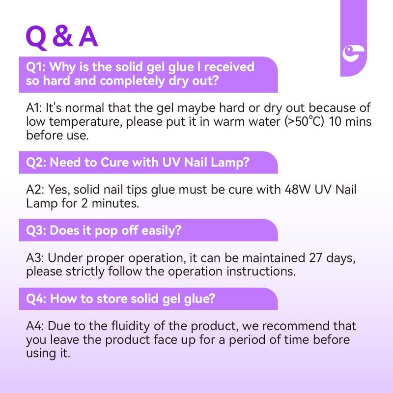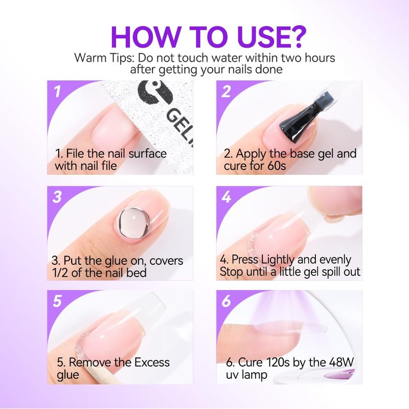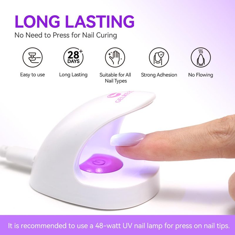 - Long Lasting Press On- This solid nail glue for press on tips is flexible and durable. While apply the soft false tips, curing the adhesive under a 48W UV/LED lamp for 120s, it can stick hard and fit well
