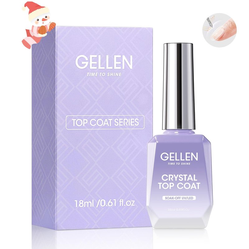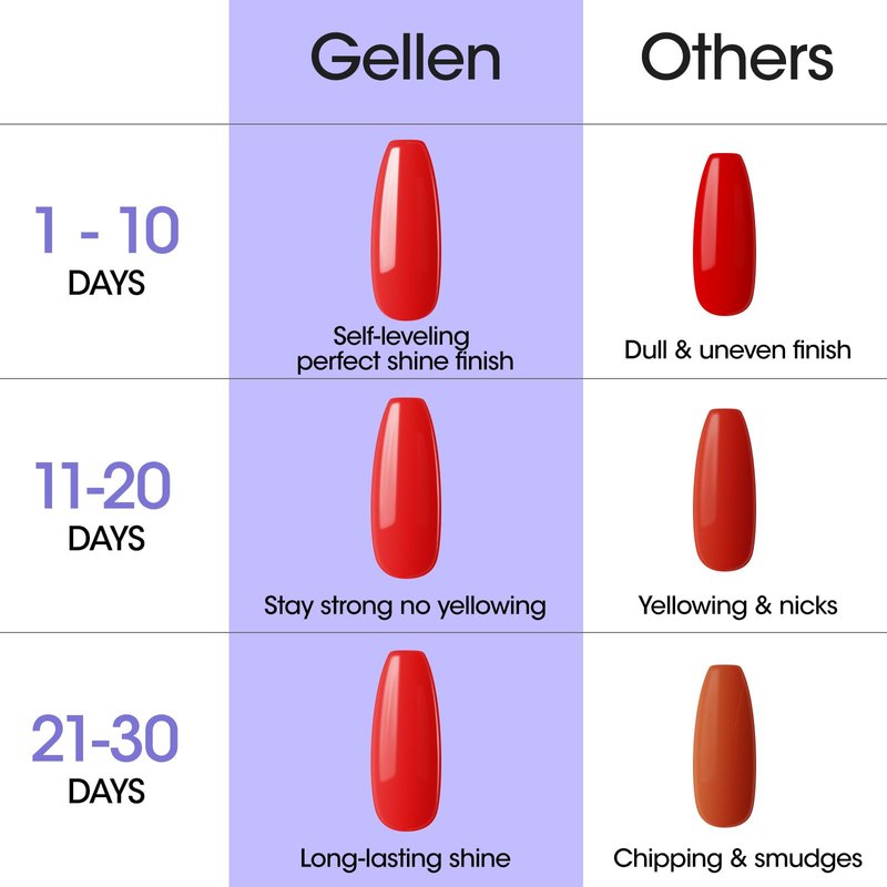 - 【Natural & Healthy No Wipe Nail Top Coat】: Gellen gel nail top coat is crafted from a gentle and natural resin formula, free of harmful ingredients, non-toxic, non-yellowing, low in odor, and skin-friendly. It effectively addresses common issues with other UV top coats such as nicks, chips, and smudges while promoting healthy nails. Feel confident in choosing Gellen top coat for your nail art manicure & nail salon!