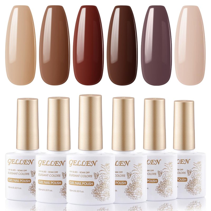 - FALL BROWN GEL NAIL POLISH SET: We put the most popular 6 brown colors together, more affordable. This is a stylish, beautiful and modern nail manicure gel polish kit, and they are autumn and Christmas gel nail polish. Comes with 6 colors brown gel polish for DIY nail manicures at home, suit for summer, winter and Christmas