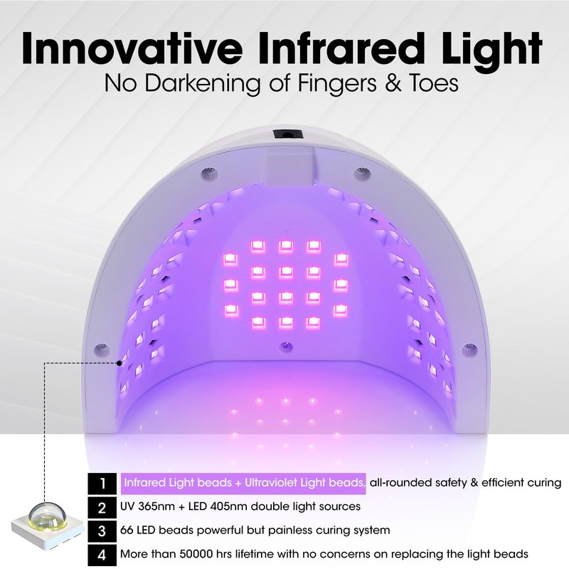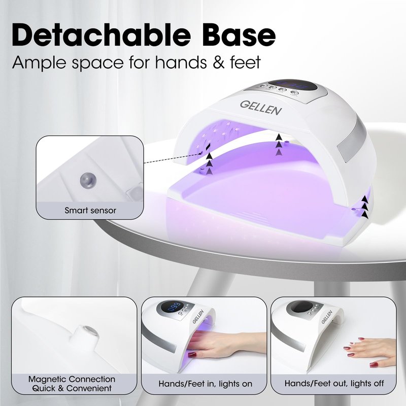 - Innovative UV Light for Gel Nails: Gellen LED nail lamp is exclusively equipped with Infrared Light beads & Ultraviolet Light beads, all-rounded safety and efficient curing. Infrared nail light cures the gel nails without harm and darkening of skin, fingernails and toes. Button 1/2, special option, adjust light intensity for nail & skin care. Great led nail dryer for gel products