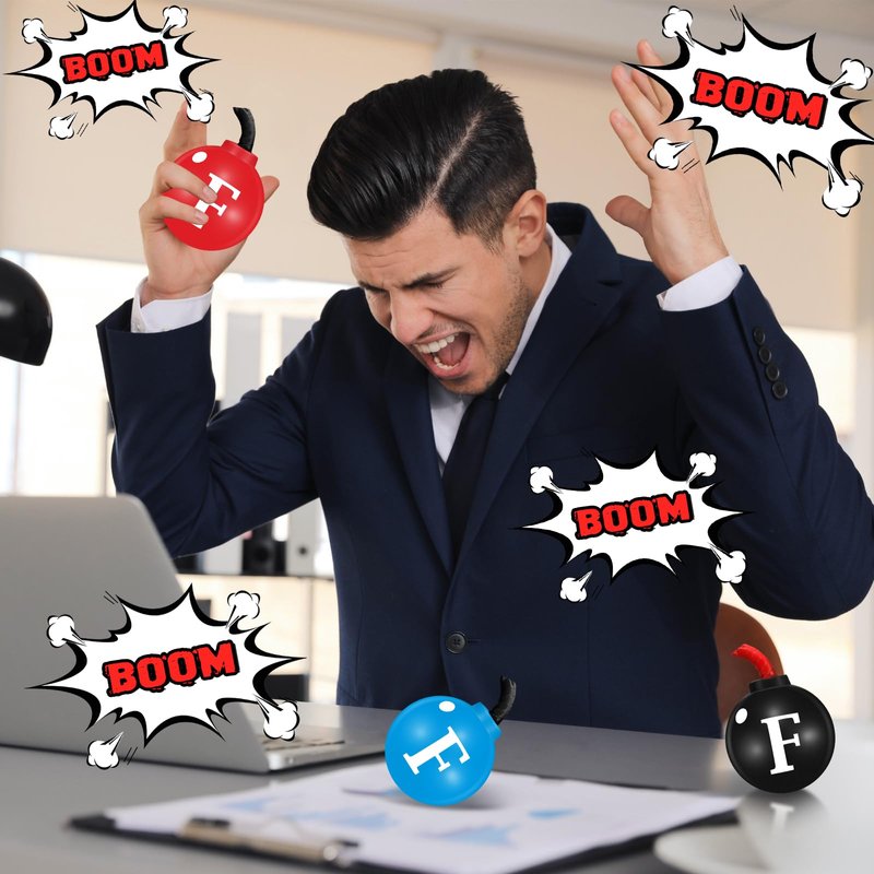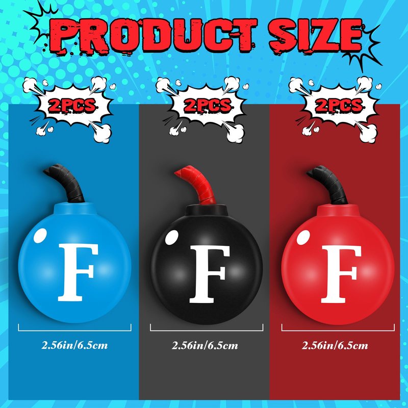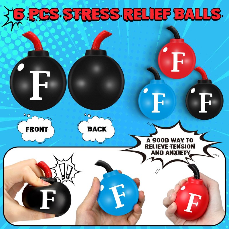 Features: Conveniently portable: The compact and lightweight nature of the F squeeze stress balls means you can easily carry it wherever you go. Whether you're in the office, on public transport, or simply lounging at home, you can always have this handy tool within reach. Improves focus and concentration: Apart from relieving stress, the F squeeze ball can help to improve your focus and concentration. As squeezing a stress ball requires a level of attention, it helps keep your mind sharp and engaged, promoting better productivity. Specifications: Material: foam Color: red, black, blue Size: about 2.56 inches/ 6.5 cm Package includes: 6 x Bomb stress ball Notes: Manual measurement, please allow slight errors on size. The color may exist a slight difference due to different screen displays. Suitable for people over 12 years old, and it's recommended to use under the supervision of adults in case of choking risk.