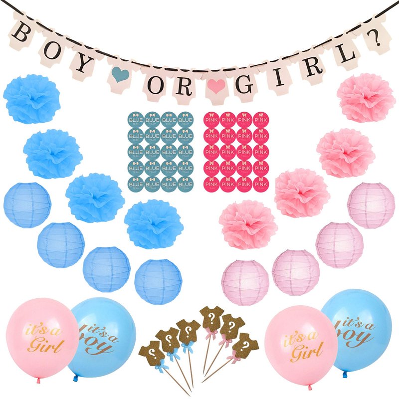 - 👦👧 Our Gender Reveals Party Set is specially customized your need. Party Bundle have cute 24-cupcake topper (12 picks with pink bow and 12 picks with blue bow), 1-Special Gender Reveal Party Banner, 14-balloons (7 pink and 7 Blue size 12 inch), TOTAL 8 Paper flower (2 Pink n 2 Blue; size 10 inch) and also (2 Pink n 2 Blue size 12 inch), 4 Paper lanterns (size 8 inch) and we are also adding a bonus gift for family 30 Team Blue and Team Pink sticker.👦👧