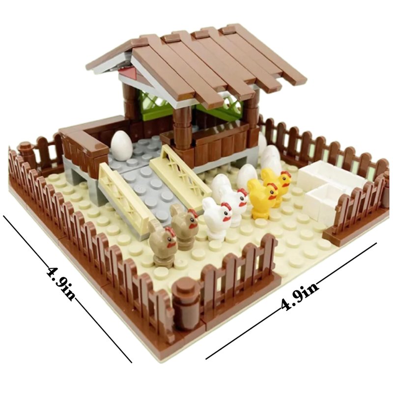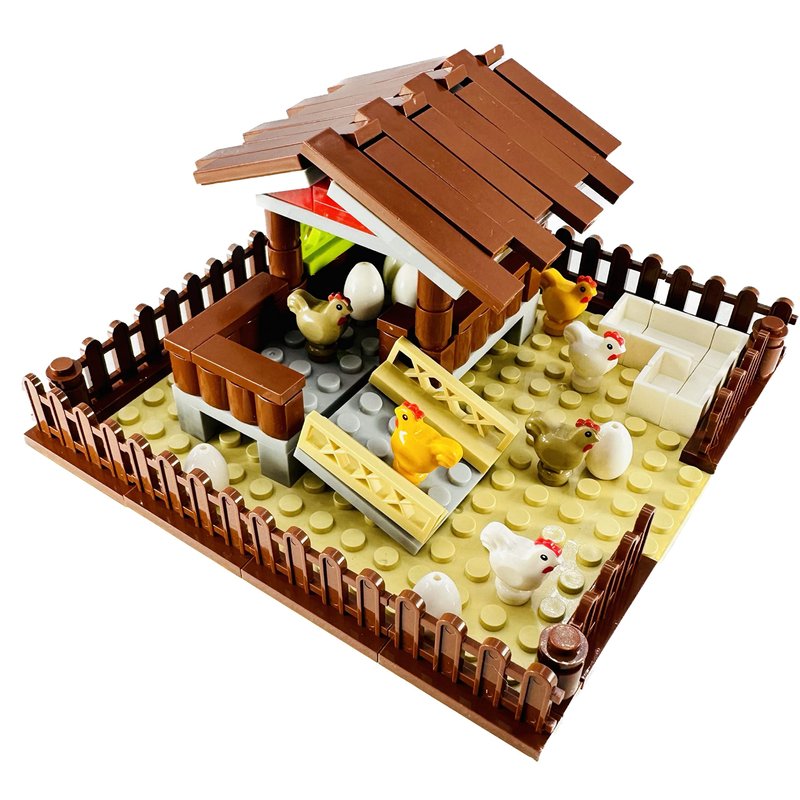- It contains 6 hens, 6 eggs, 13 pieces of fencing, and a baseplate as well as pieces to build your own coop and feeding trough. This coop is fun and creative to build and can be added to other rural sets like our barnyard set or our country garden set. If you have a city streets group branch out into a rural country scene or have city chicken in your back yard. The finished build measurements are 4.8 in x 4.8 in x 2.56 in.
