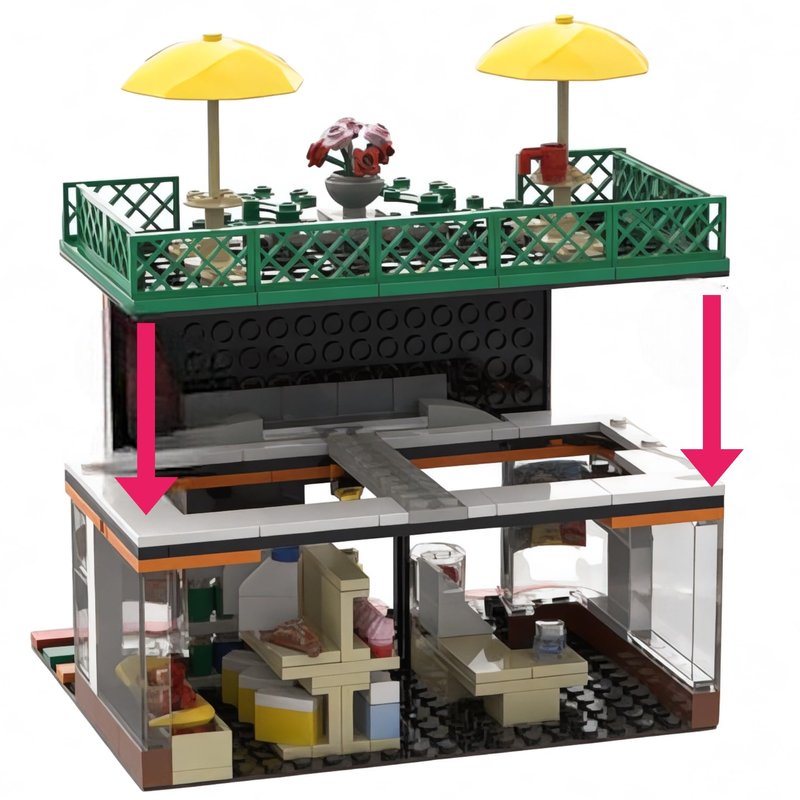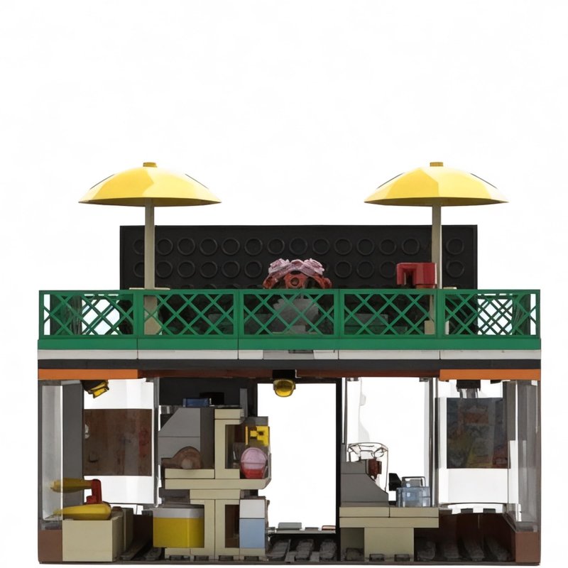- Chill on the Rooftop Patio – The upper-level patio features cozy tables, umbrellas, and blooming flowers, adding a relaxing space to your city build. Whether it’s a roadside snack spot or a late-night hangout, this modular design allows endless ways to customize your urban setup.