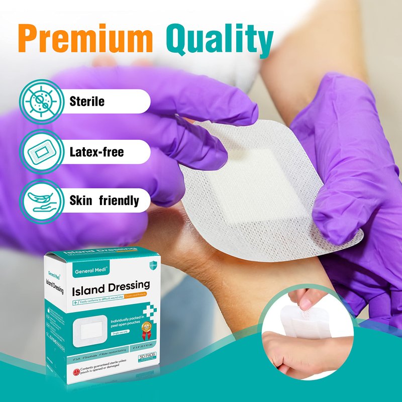 General Medi Sterile Island Dressing Bordered Gauze – 50 Count, 4" x 4" Gauze Pads, Wound Care Pad with Adhesive Border - Sterile, Soft & Highly Absorbent Medical Grade Dressing Pad