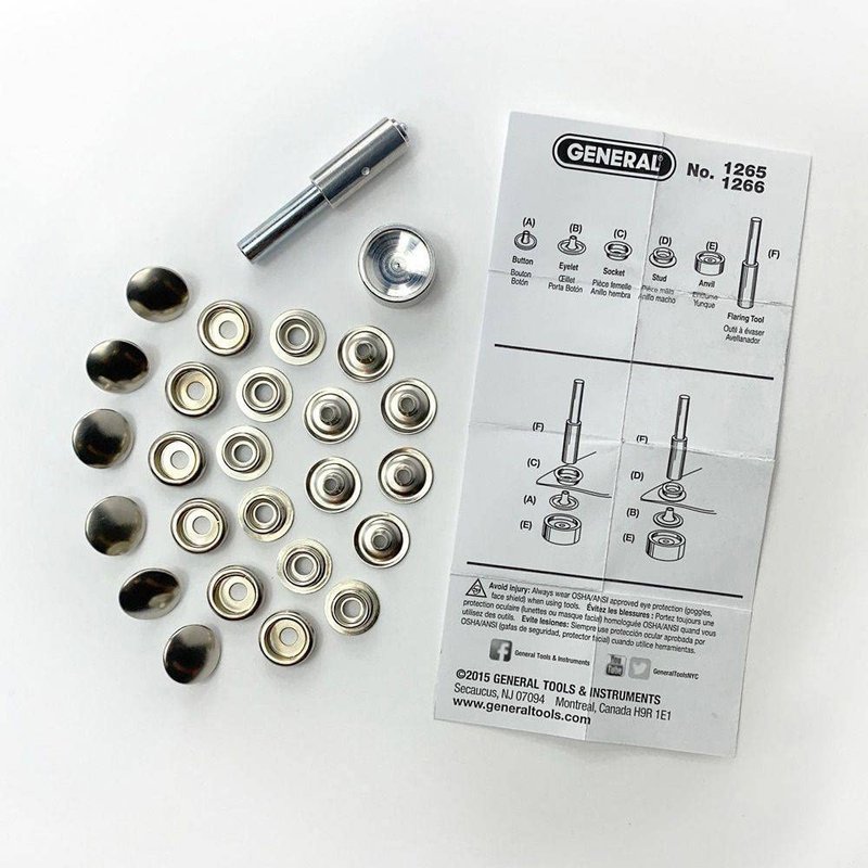 - Made in the USA; Refills available through General Tools and Instruments 1266 Snap Fastener Refills, 6 Fastener Sets