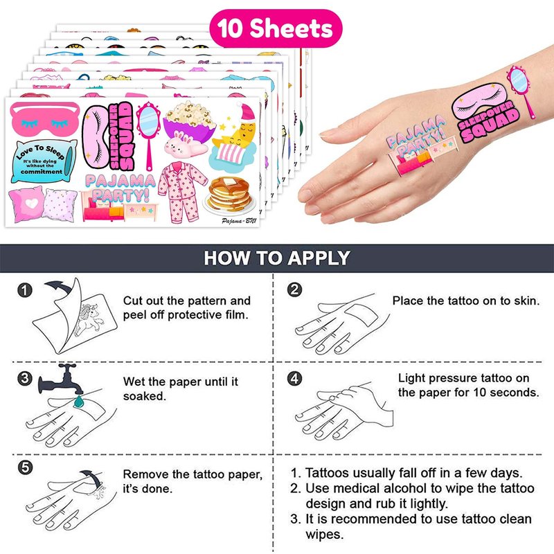 💤PACKAGE INCLUDES:The package includes 10 sheets, each with 96 PCS and measures 6.1 x 3.1 inches, as well as a full set of PAJAMA tattoos. This amazing ornament assortment is sure to exceed your expectations. 💤UNIQUE DESIGNS: These PAJAMA tattoos feature various patterns including pillows, moons, slippers, and patches. These charming designs will make your party stand out and provide a delightful experience for your guests. 🔔APPLICABLE OCCASIONS: Suitable for PAJAMA theme parties, slumber theme parties, sleepover theme parties, girls parties, baby showers, birthday parties, family gatherings, celebrations, or any other events. ♻️SAFE AND HIGH QUALITY: We create temporary tattoos using high-quality, eco-friendly paper that is safe to use. Our tattoos are visually appealing and made with utmost care for our clients' safety. 📌HOW TO APPLY: Firstly, cut out the pattern and peel off protective film. Secondly, place the tattoo on to skin or objects like a water bottle, purse, laptop,phone case,etc. Next, wet the paper until it soaked.Then, light pressure tattoo on the paper for 10 seconds.Finally, remove the tattoo paper it's done. Go ahead and enjoy your stunning new look! And You'll have a gorgeous, velvety tattoo that can be easily removed with baby oil, soap, or water. 💌THINGS TO NOTES: Do not apply around eyes, lip or sensitive skin area.Under no circumstances should anyone under the age of four use this without adult supervision. Our team is always here to help and make sure you have a positive shopping experience. Please do not hesitate to contact us for assistance.