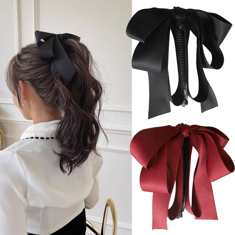 Generic 2 PCS Ribbon Bow Banana Clip Vertical Ponytail Claw Clip Bowknot Hair Clip for Women Girls Korean Style Banana Barrette Sweet Hair Accessories Ponytail Holder, Black,red