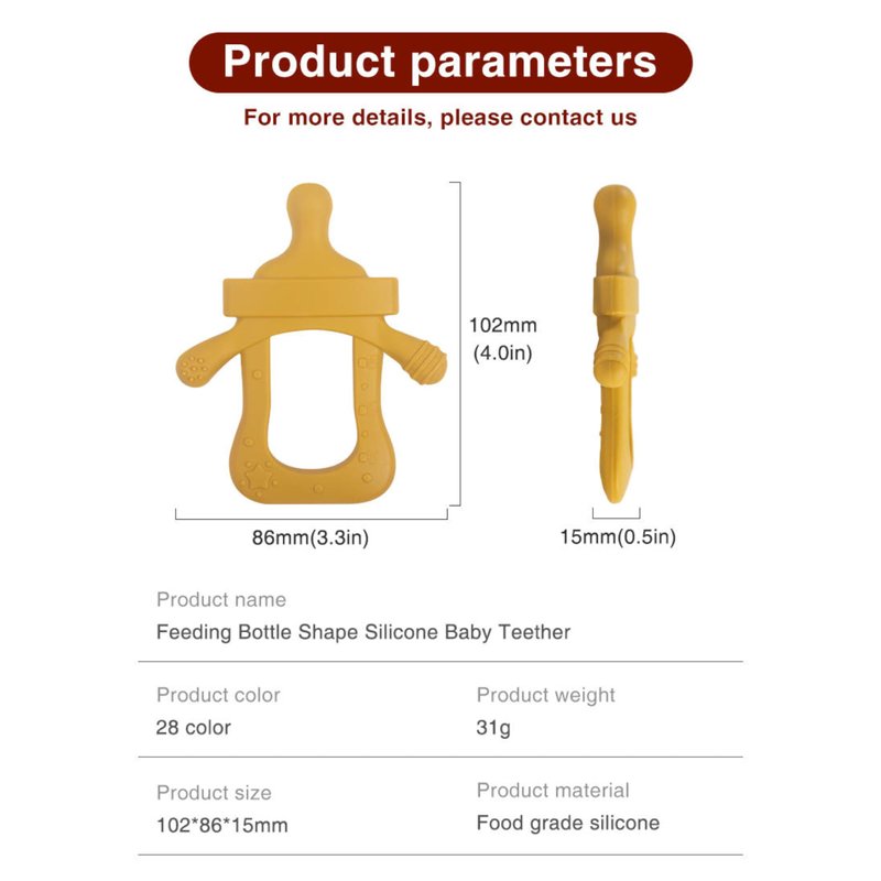 Soft, Safe Silicone: Made from high-quality, food-grade silicone, this teether is soft yet durable, providing the perfect texture for tender gums. Its BPA-free, non-toxic material ensures a safe chewing experience for your baby. Ergonomic Bottle Shape: The unique baby bottle shape is not just adorable; it's also ergonomically designed for tiny hands to grasp and hold easily, promoting motor skill development as they play and chew. Gentle Massage: The textured surfaces offer a gentle massage to soothe baby's sore gums, reducing discomfort and fussiness. It's designed to reach all the right spots in your baby's mouth, providing relief from teething pain. Easy to Clean: Hygiene is paramount, which is why our teether is dishwasher safe and easy to sterilize. It's also freezer-friendly, offering an extra cooling sensation to soothe inflamed gums. Portable & Durable: Lightweight and easy to carry, it's the perfect teether for on-the-go relief. Its durable construction ensures it can withstand countless hours of chewing without losing its effectiveness. Why Choose Our Silicone Baby Bottle-Shaped Teether? With its baby-friendly design, our teether not only alleviates the discomfort of teething but also engages your little one in a comforting, familiar experience. It's an ideal gift for new parents, baby showers, or as a thoughtful addition to your baby's essentials.
