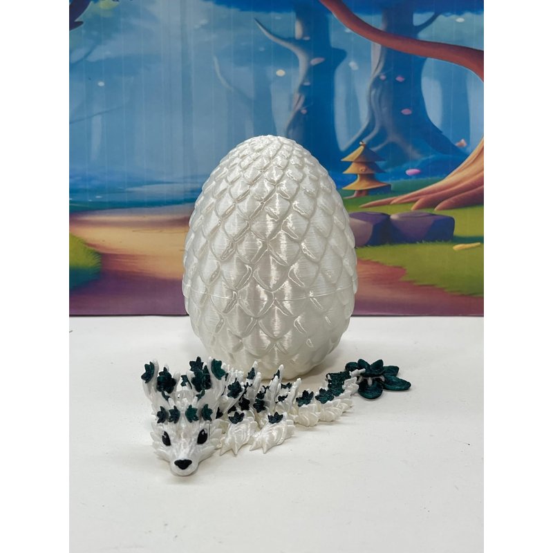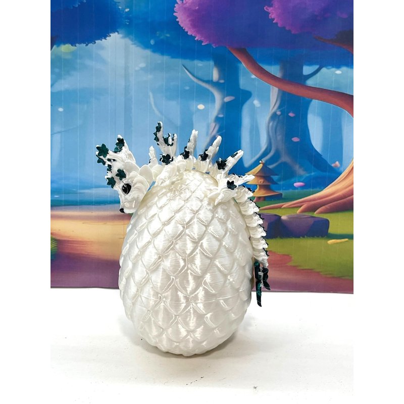 3D Printed enchanting Articulated Dragon - a mystical creature that brings a touch of fantasy to your world. Unveil the mystery of the Scaled silky White Dragon Egg and this White and Green Cherry Blossom Baby Dragon ( measures 6" long) a captivating fusion of elegance and fantasy. Encased within a meticulously designed crystal egg, this tiny dragon reveals itself with a symphony of colors - a testament to its magical heritage. ------- Small Components Advisory: ------- Please note that this product may contain small components and might not be suitable for very young children. Given the characteristics of 3D printing, there is a potential for small components to detach if handled aggressively or dropped. Therefore, we advise against allowing younger children to interact with the dragon. Please consider that 3D printed objects might include minor imperfections such as layer lines. These are a natural and inherent aspect of the printing process. We strive to produce the highest quality items, and these imperfections contribute to the unique character of each piece. Recall the unique creation of each dragon, crafted exclusively for you. The color selections available are depicted in the provided photos. Please be aware that variations in color may occur due to discrepancies in filament production and the characteristics of the monitor or screen you are utilizing to view the listing. Additionally, the arrangement of prints using multi-colored filament rolls can influence color distribution. ------- Licensing Information: ------- Authorized Design: NOHo3D holds the official authorization for the production of this exquisite design created by CinderWing3D.