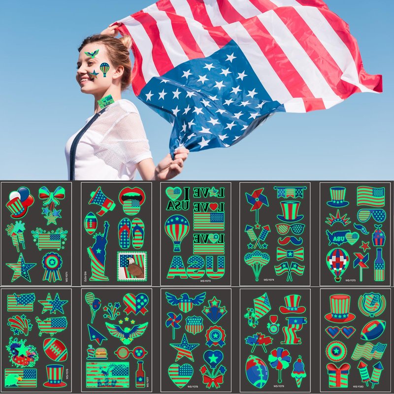 - 4th of July Glow in the Dark Patriotic Temporary Tattoos: Our Independence Day tattoo stickers are exquisite and cute, full of classic elements of the patriotic holiday, such as the American flag, the Lady of Independence, stars, fireworks, hats, sunglasses, balloons, etc., with bright colors that make you You feel the festive atmosphere.