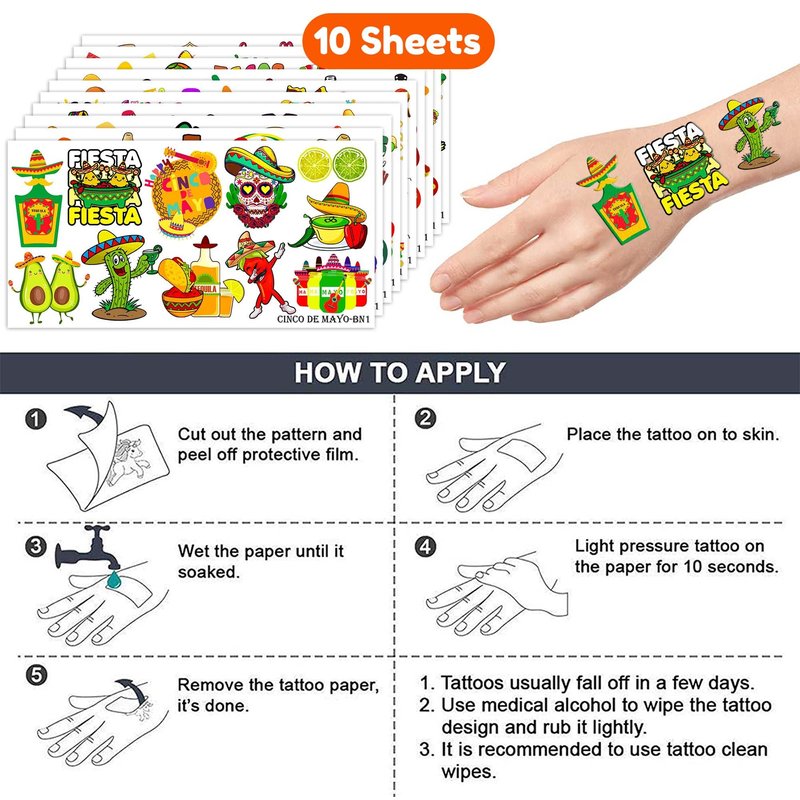 - 🥑UNIQUE DESIGNS: Fiesta-themed tattoos patterns includetacos, cacti, chili peppers, maracas, skulls, and alpacas. Each tattoo comes with a brilliant color that can be joined together to create dazzling CINCO DE MAYO party. Are you ready to add some color to your lively carnival party?