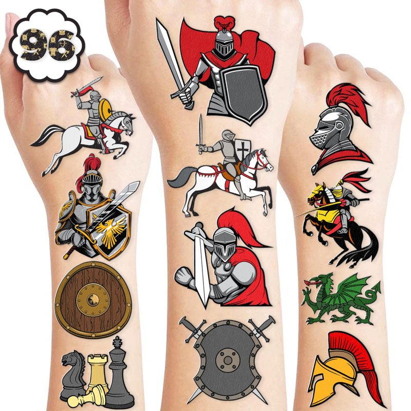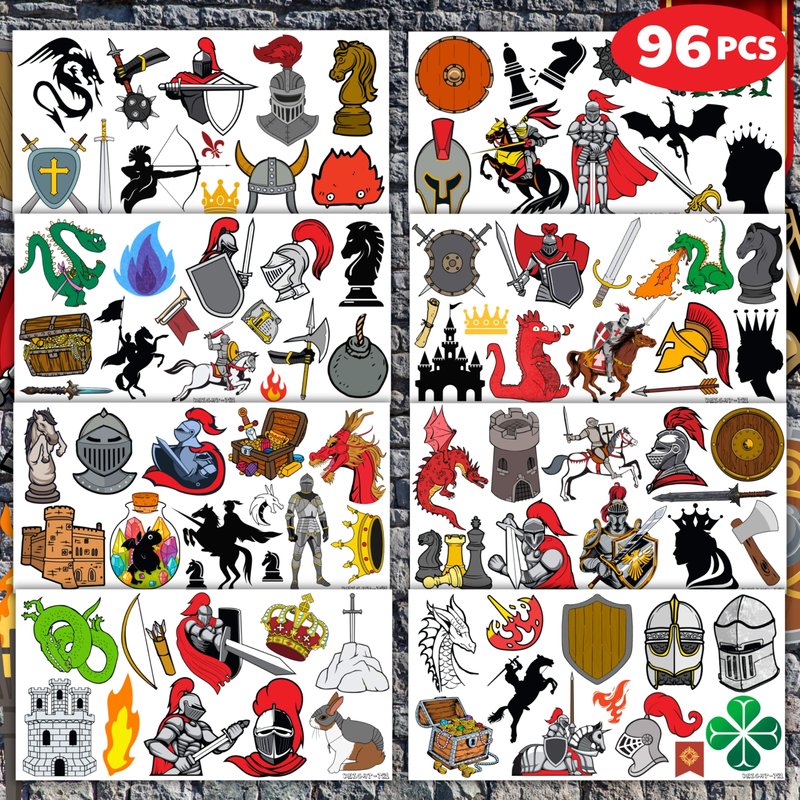 - 🛡️【IDEAL TATTOOS FOR THEMED MEDIEVAL KNIGHT DECOR】: This set of temporary Medieval Knight-themed tattoo stickers comprises 8 sheets in total, featuring a total of 96 PCS striking, distinct designs. They are excellent for distributing as party favors and small gifts with a Medieval Knight theme for holidays. Each sheet measures 6.1 * 3.1 inches, making them suitable for boys and girls of all sizes.