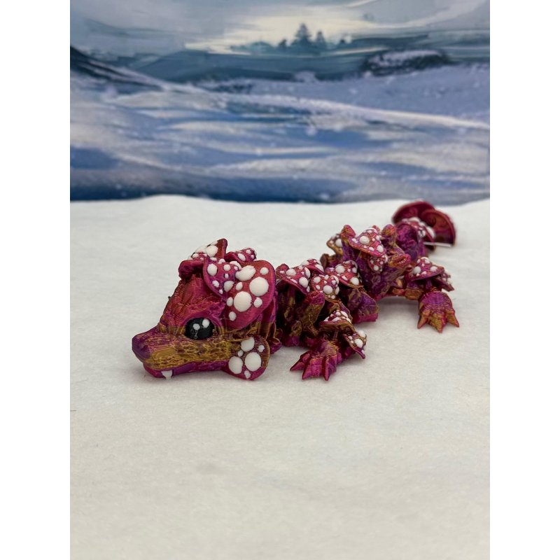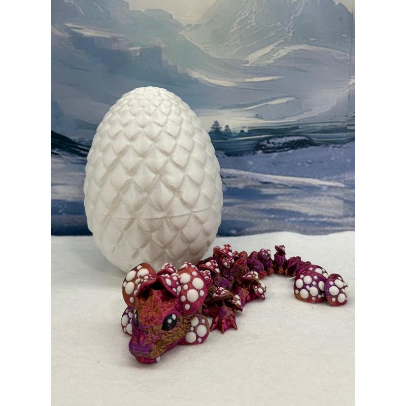 3D Printed enchanting Articulated Dragon - a mystical creature that brings a touch of fantasy to your world. Unveil the mystery of the Scaled silky White Dragon Egg & this Red Purple Gold Baby Mushroom Dragon ( measures 6" long) a captivating fusion of elegance and fantasy. Encased within a meticulously designed crystal egg, this tiny dragon reveals itself with a symphony of colors - a testament to its magical heritage. ------- Small Components Advisory: ------- Please note that this product may contain small components and might not be suitable for very young children. Given the characteristics of 3D printing, there is a potential for small components to detach if handled aggressively or dropped. Therefore, we advise against allowing younger children to interact with the dragon. Please consider that 3D printed objects might include minor imperfections such as layer lines. These are a natural and inherent aspect of the printing process. We strive to produce the highest quality items, and these imperfections contribute to the unique character of each piece. Recall the unique creation of each dragon, crafted exclusively for you. The color selections available are depicted in the provided photos. Please be aware that variations in color may occur due to discrepancies in filament production and the characteristics of the monitor or screen you are utilizing to view the listing. Additionally, the arrangement of prints using multi-colored filament rolls can influence color distribution. ------- Licensing Information: ------- Authorized Design: NOHo3D holds the official authorization for the production of this exquisite design created by CinderWing3D.