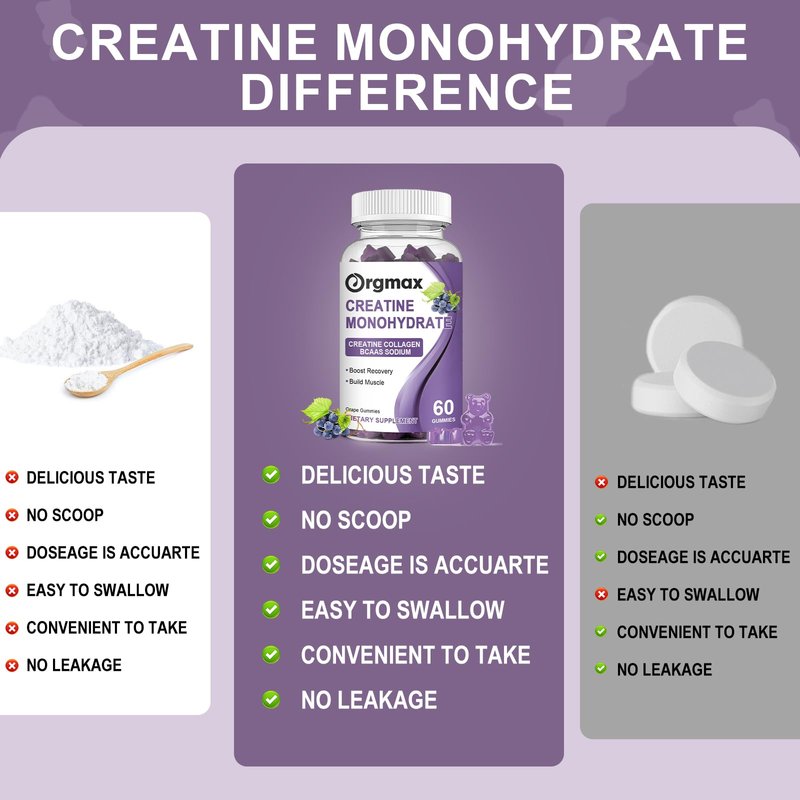 Unlike creatine pills or creatine powder, each of our creatine BCAA combo gummies is perfectly sized for easy consumption, ensuring hassle-free usage wherever you go. Simply chew and enjoy 2-4 gummies daily to fuel your workouts, support muscle recovery, and achieve your goals. They are an excellent muscle gain supplement for muscle builders or a load boost for men and women.