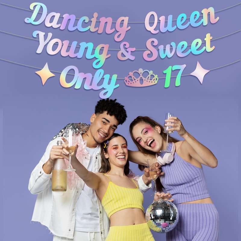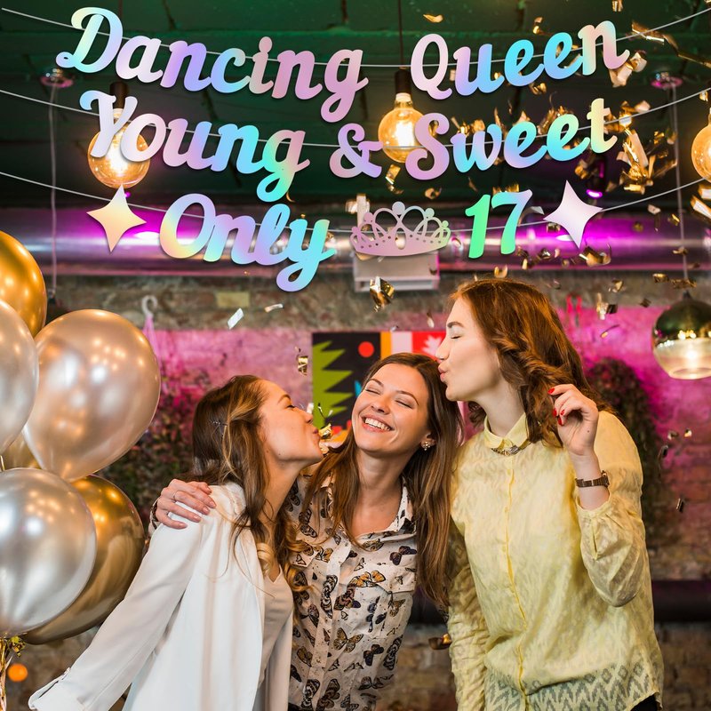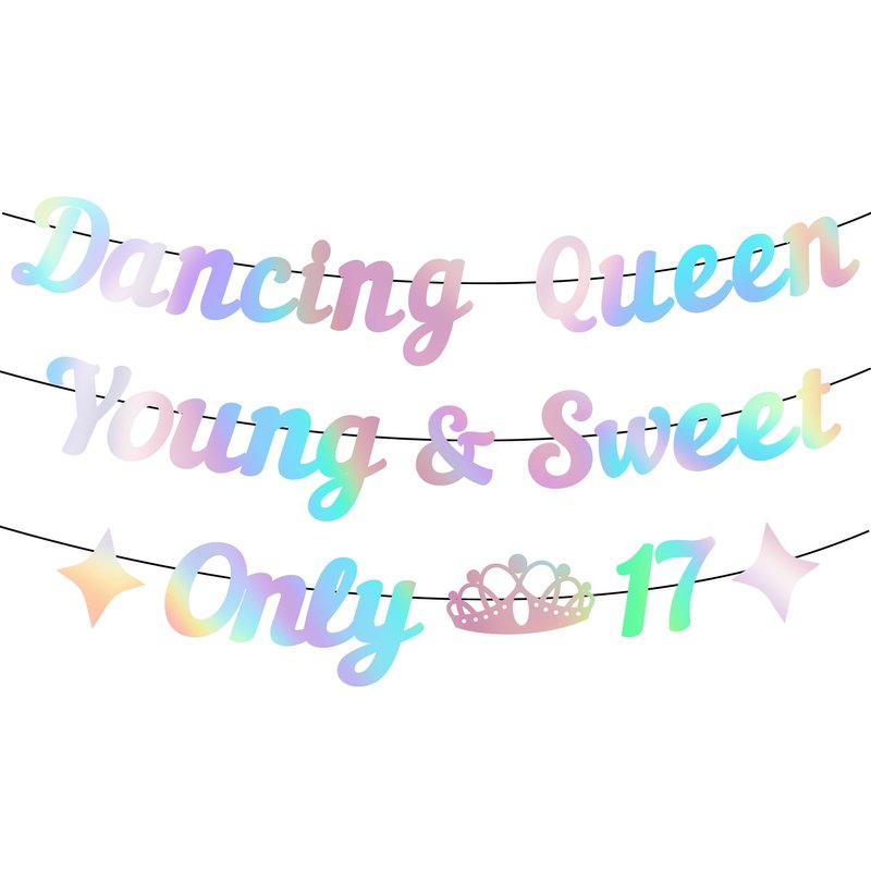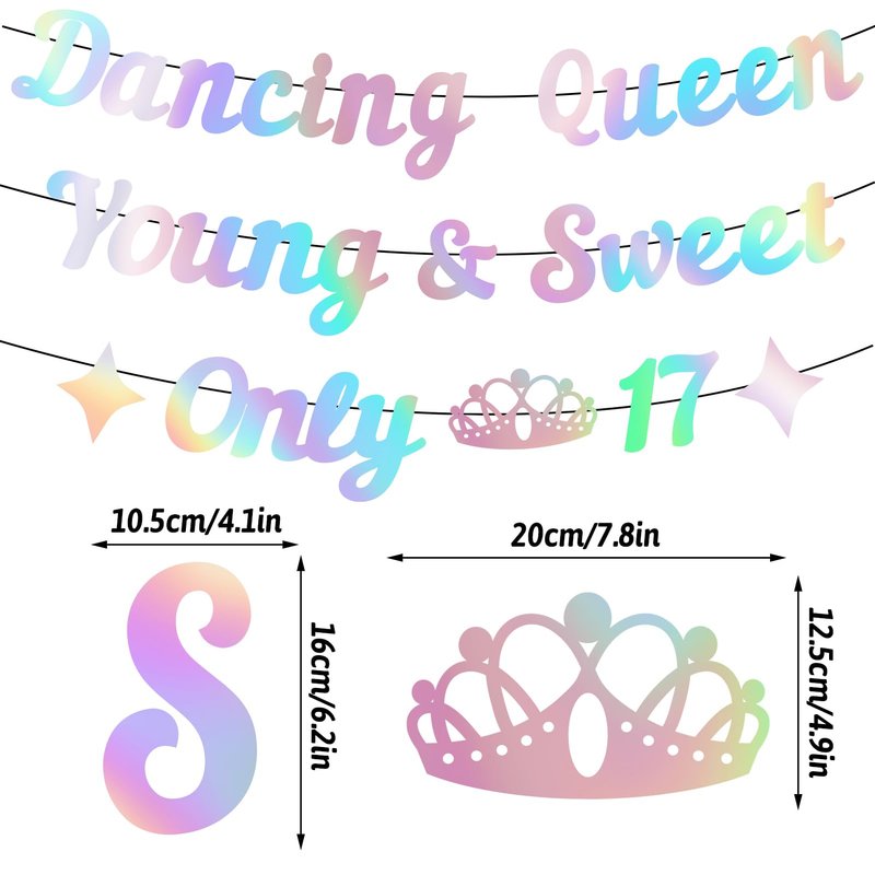 - 17th Birthday Decorations for Girls: Our 17th birthday decorations include 1 set glitter “Dancing Queen Young & Sweet Only 17”banner, clear font cuts and novel style, Iridescent decorations they will add a different feeling to your birthday party and leave a deep impression on everyone, you can easily get the attention and favor of everyone