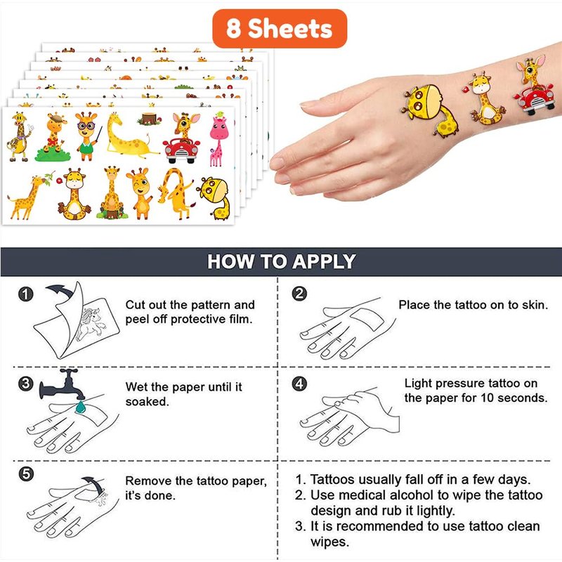 🦒【IDEAL TATTOOS FOR THEMED GIRAFFE DECOR】: This set of temporary Giraffe-themed tattoo stickers comprises 8 sheets in total, featuring a total of 96PCS striking, distinct designs. They are excellent for distributing as party favors and small gifts with a Giraffe theme for holidays. Each sheet measures 6.1 * 3.1 inches, making them suitable for boys and girls of all sizes. 🎁【FANTASTIC GIFT OPTIONS FOR GIRAFFE PARTY SUPPLIES AND DECORATIONS】: When you adorn your child's birthday party with a Giraffe theme, you'll be showered with compliments. Don't miss out on giving your boys and girls Giraffe tattoos, as they make for a wonderful small gift. 🌍【SAFE AND ECO-FRIENDLY】: Our temporary tattoos are crafted from materials that prioritize safety and environmental consciousness. These tattoos are made using paper that is both safe for users and gentle on the planet. 🥳【INJECT SOME FUN】: Fed up with ordinary gifts? We've got just the thing! Our assortment of charming and lively temporary tattoo designs can be affixed to laptops, backpacks, desks, suitcases, books, water bottles, and beyond. These whimsical touches are bound to enhance your visual surroundings and infuse a bit of happiness into your daily essentials. 🌴【SIMPLE APPLICATION AND REMOVAL】: Simply cut out each tattoo from the sheets and peel off the clear film. You can apply it to your hands, face, arms, or any area you feel comfortable. Additionally, you can place it on glasses, clothing, or a smooth flat surface. Afterward, thoroughly wet it with water and wait for 20-30 seconds before removing the backing paper. Voilà, you now have a smooth, velvety tattoo! 👍【EXCELLENT CUSTOMER SERVICE】: Should you encounter any challenges while using our product, don't hesitate to reach out to us. We are committed to resolving any issues and ensuring you have an exceptional shopping experience.
