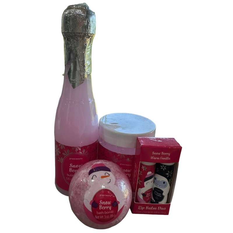 Generic Groovy 4 Piece Bath & Body Self Care Pack in Snow Berry Includes Bubble Bath, Body Scrub, Lip Balm Duo, Bath Bomb