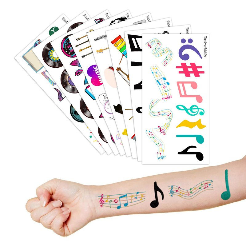 - đ”ăIDEAL TATTOOS FOR THEMED MUSIC DECORă: This set of temporary Music-themed tattoo stickers comprises 8 sheets in total, featuring a total of 96PCS striking, distinct designs. They are excellent for distributing as party favors and small gifts with a Music theme for holidays. Each sheet measures 6.1 * 3.1 inches, making them suitable for boys and girls of all sizes.