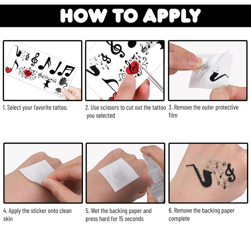 - đŽăSIMPLE APPLICATION AND REMOVALă: Simply cut out each tattoo from the sheets and peel off the clear film. You can apply it to your hands, face, arms, or any area you feel comfortable. Additionally, you can place it on glasses, clothing, or a smooth flat surface. Afterward, thoroughly wet it with water and wait for 20-30 seconds before removing the backing paper. VoilĂ , you now have a smooth, velvety tattoo!