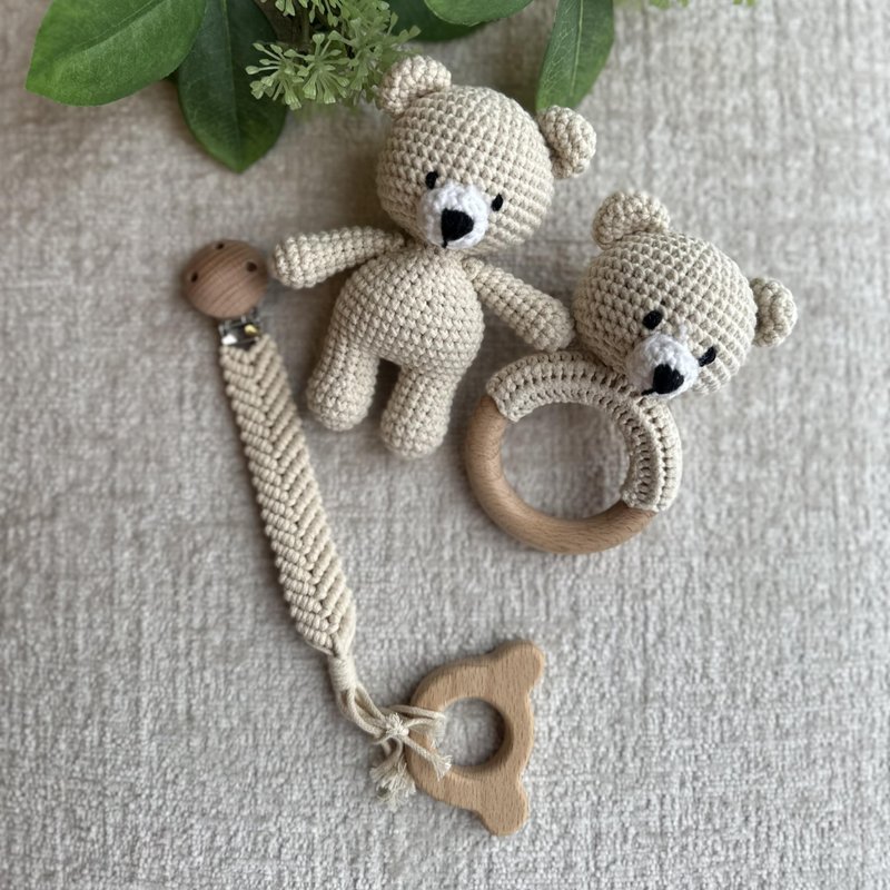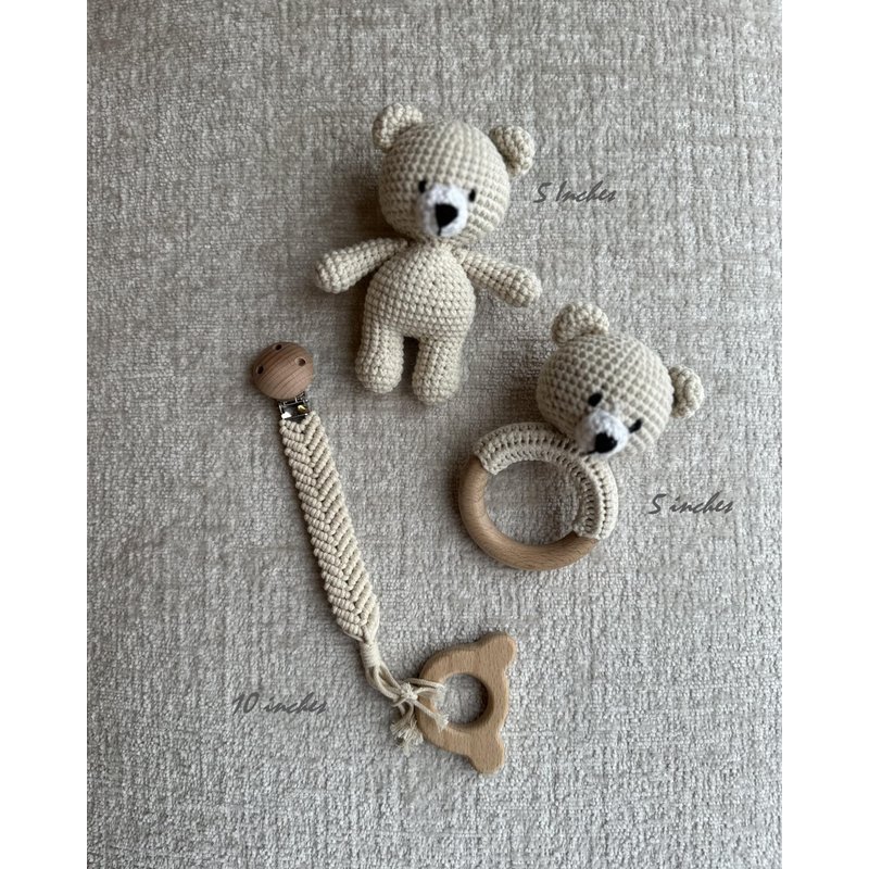 - Organic cotton 100% handmade crotchet bear rattle, toy, teether and pacifier holder baby shower/birthday gift set.
